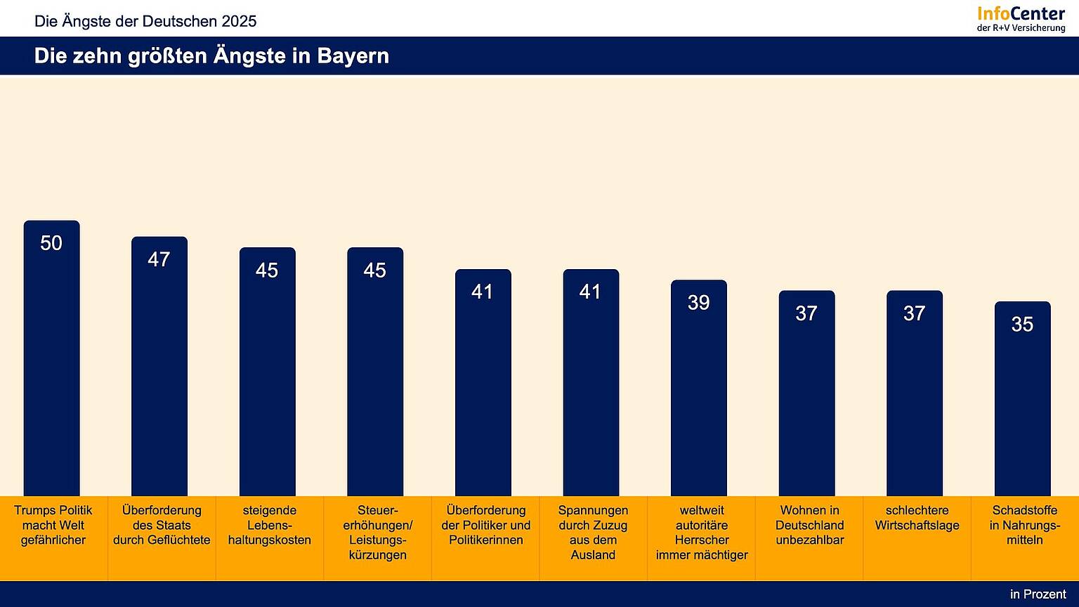 Sorgenkind Trump: Jeder zweite Befragte in Bayern fürchtet sich vor den Folgen der Trump-Politik. Dies ist die einzige Sorge der Bayern, die über dem Bundesdurchschnitt liegt. Grafik: R+V