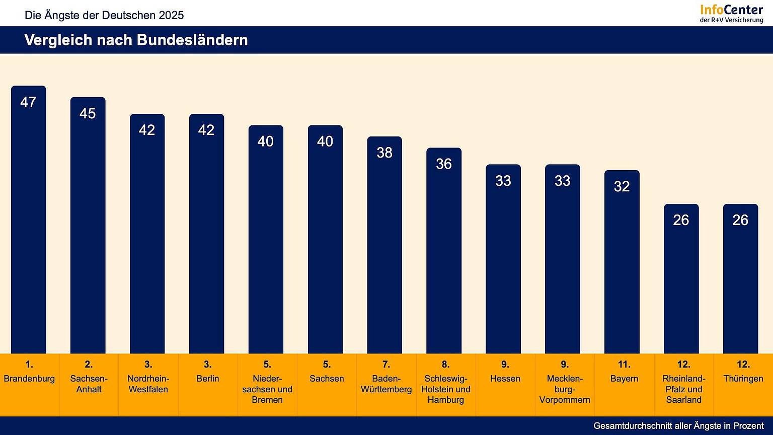 In fast allen Bundesländern hat sich die Stimmung 2025 verbessert. Am wenigsten Angst haben die Menschen in Rheinland-Pfalz, im Saarland und in Thüringen, Bayern folgt mit wenig Abstand. Die größten Sorgen machen sich wie im Vorjahr die Befragten in Brandenburg und Sachsen-Anhalt. Grafik: R+V