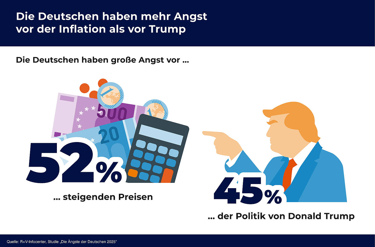 52 Prozent der Deutschen haben Angst vor steigenden Preisen, 45 Prozent vor der Politik Donald Trumps. In Bayern ist es umgekehrt: 50 Prozent der Menschen im Freistaat treibt die Politik des US-Präsidenten um, nur 45 Prozent haben Angst vor steigenden Lebenshaltungskosten (siehe auch den Absatz „Die Ängste der Bayern“ am Ende des Artikels). Grafik: R+V