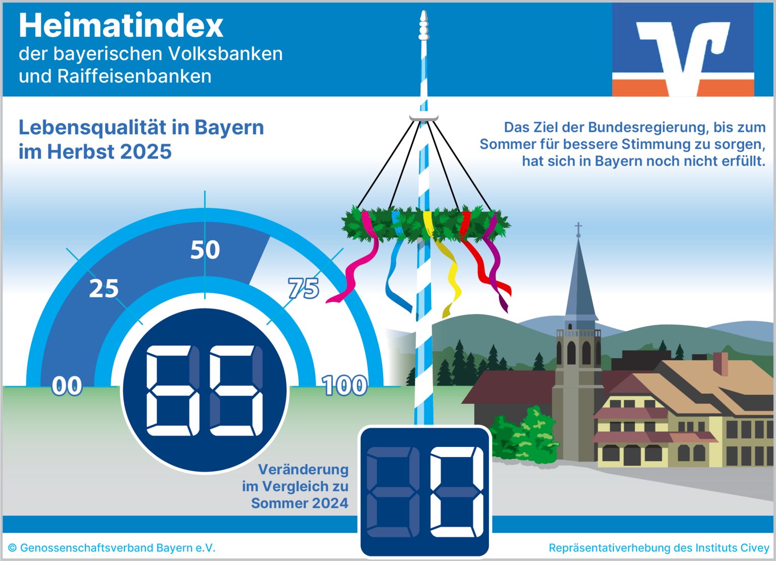 Der Heimatindex der bayerischen Volksbanken und Raiffeisenbanken wird jährlich im Rahmen einer repräsentativen Bevölkerungsumfrage ermittelt. Für die Studie hat das Befragungsinstitut Civey vom 28. August bis 18. September 2025 online 3.000 Personen aus Bayern befragt, für die Vergleichsfrage zur allgemeinen Lebenszufriedenheit weitere 10.000 Personen außerhalb Bayerns. In der Umfrage bewerten die Befragten einzelne Aspekte der Kategorien „Allgemeine Lebenszufriedenheit“, „Vernetzung mit Freunden und Familie“, „Freizeit, Kultur und Bildung“, „Arbeitsplatz und persönliche finanzielle Situation“, „Wohnen, Umwelt und Sicherheit“ sowie „Technische Infrastruktur und Grundversorgung“ auf einer Skala von 0 bis 5. Aus diesen Teilergebnissen wird der Index berechnet.
