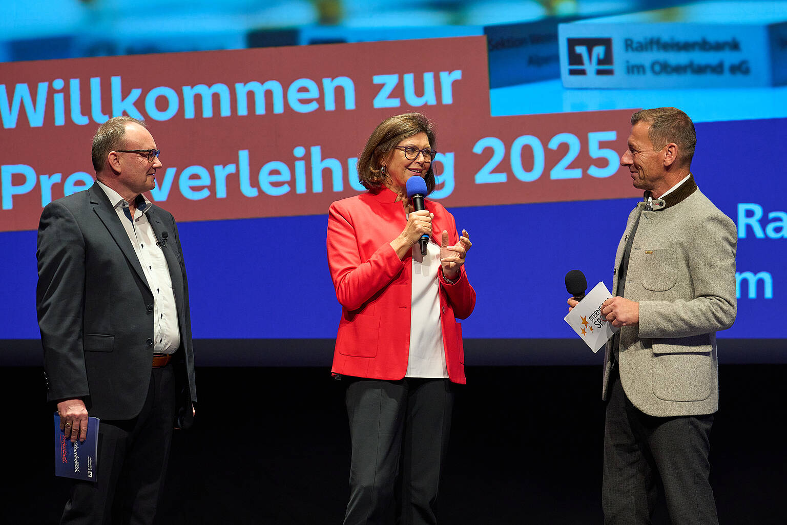 Landtagspräsidentin Ilse Aigner im Gespräch mit Bankvorstand Manfred Gasteiger (li.) und BR-Moderator Markus Othmer bei der Preisverleihung in Miesbach.