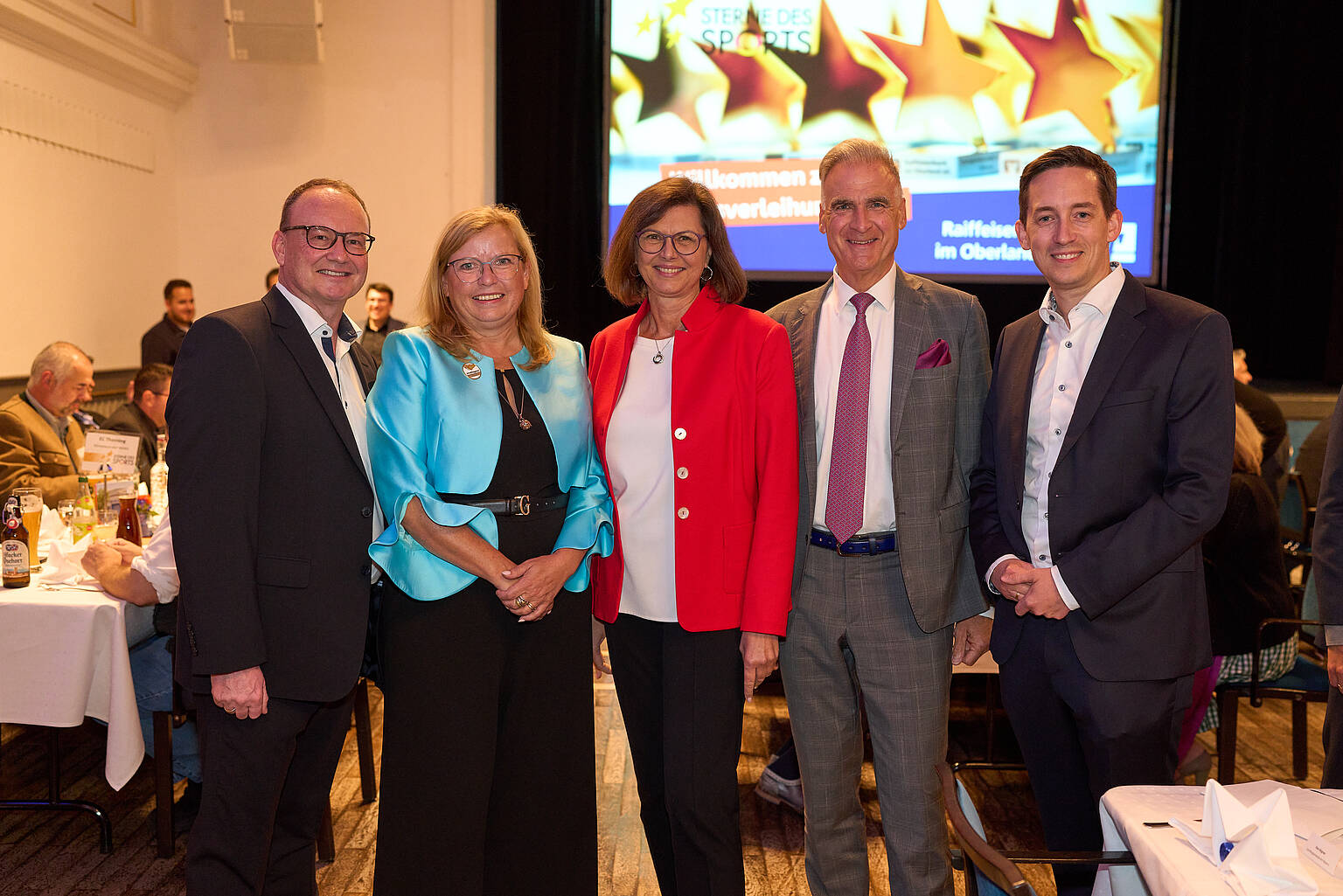 Wertschätzung für die „Sterne des Sports“ (v. li.): Manfred Gasteiger, Vorstandsvorsitzender der Raiffeisenbank im Oberland, Gabi Schmidt, Ehrenamtsbeauftragte der Bayerischen Staatsregierung, Landtagspräsidentin und Stimmkreisabgeordnete Ilse Aigner, Olaf von Löwis of Menar, Landrat des Landkreises Miesbach, sowie Johannes Paul, Vorstandsmitglied der Raiffeisenbank im Oberland.