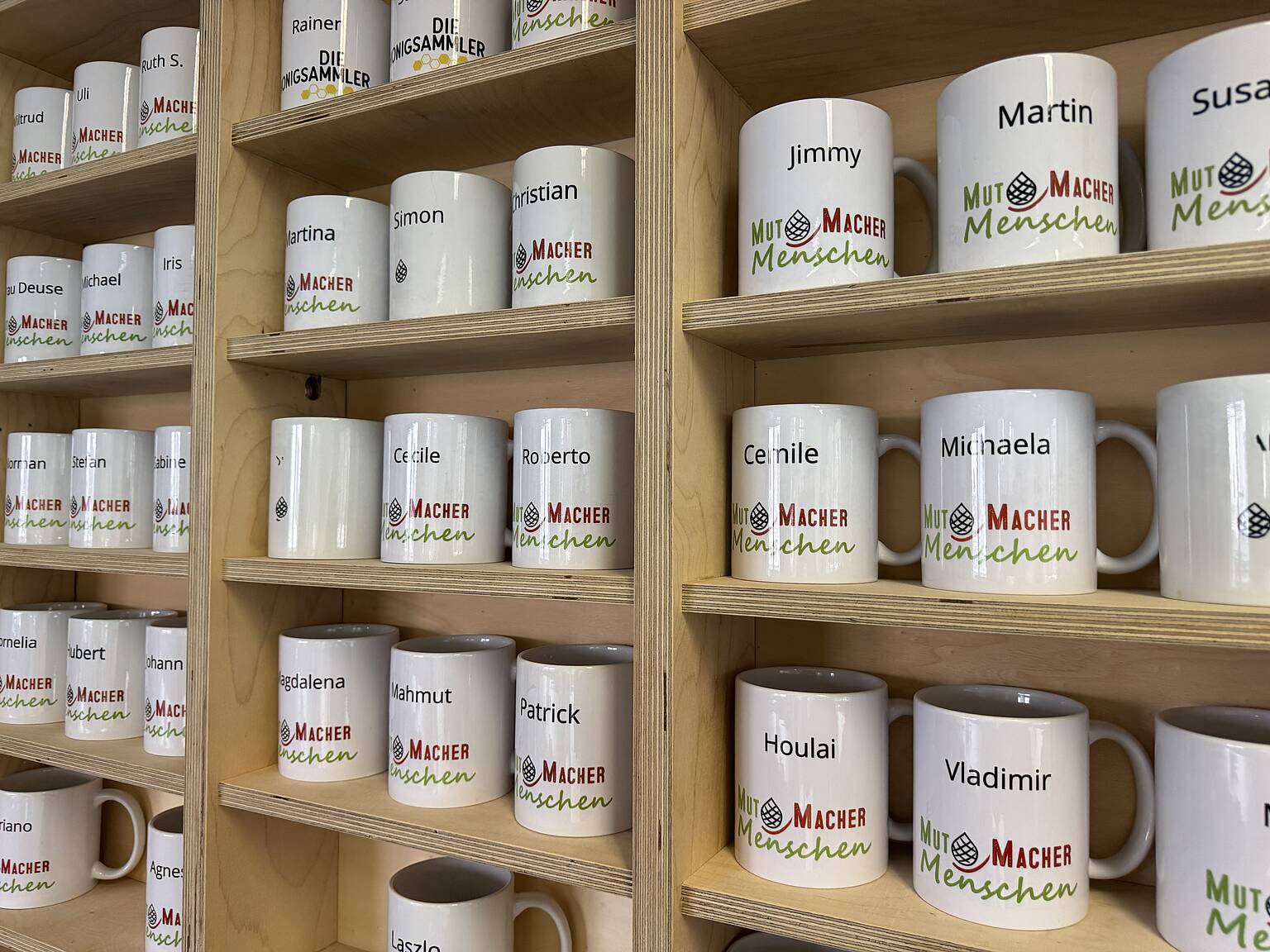 Wer bei den MutMacherMenschen anfängt, erhält eine Mutmacher-Tasse mit seinem Namen. Die Tassen stehen gut sichtbar in einem Wandregal im Pausenraum – so sind sie nicht nur griffbereit, sondern verbildlichen die Gemeinschaft.