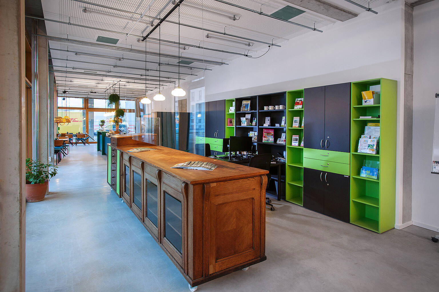 Zentrale Anlaufstelle im Quartier: Gleich neben dem Café informiert die Genossenschaft über alle Aktivitäten im Prinz Eugen Park. Dort können die Bewohner auch Gemeinschaftsräume oder ein Lastenfahrrad buchen. Foto: GeQo