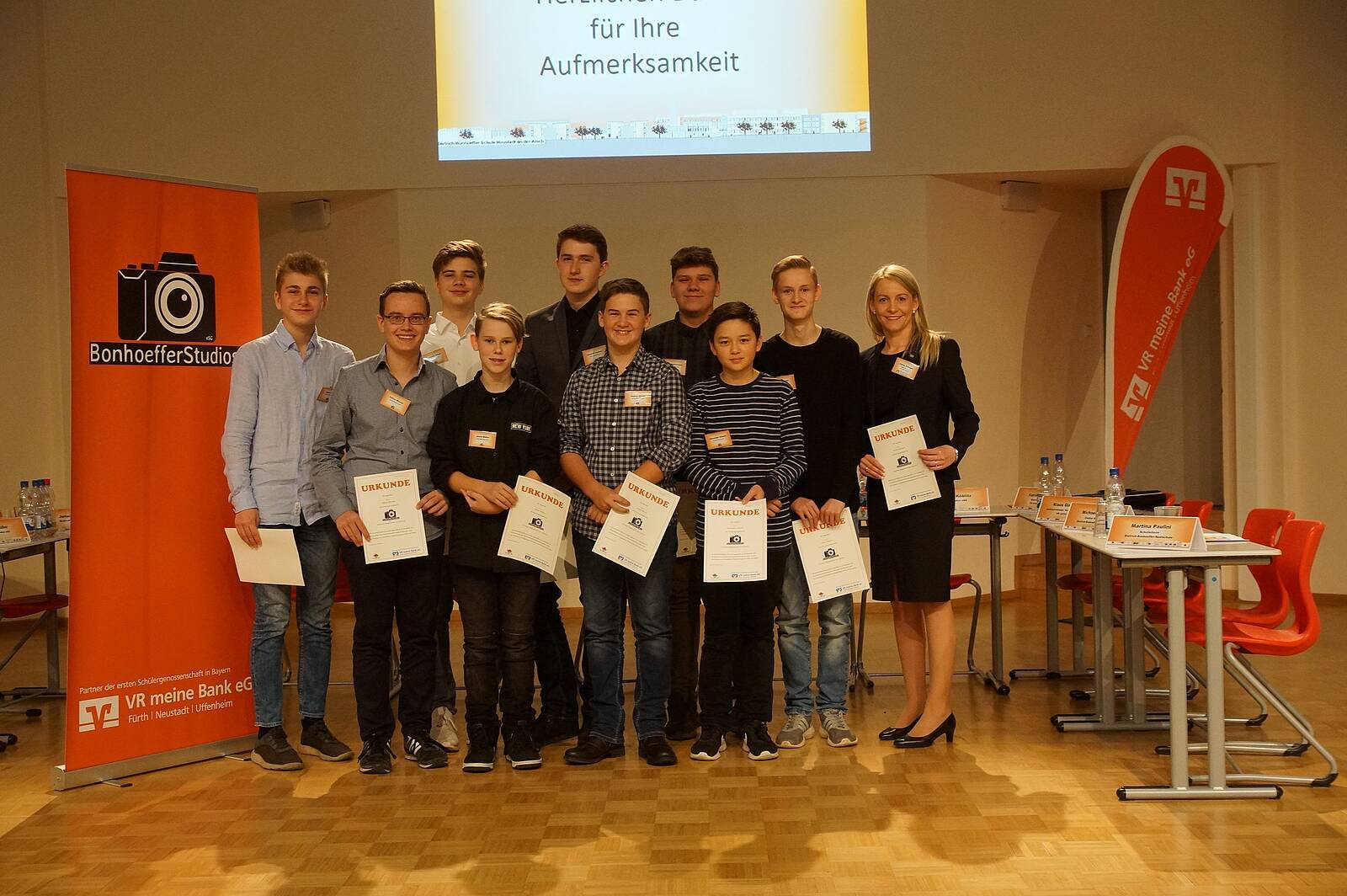 „Ich werde fleißig für Euch die Werbetrommel rühren“, versprach auch Rektorin Paulini. Zusammen mit Katrin Zeilinger, Regionaldirektorin bei der VR meine Bank, hatten die Schüler im Vorfeld die Satzung der Genossenschaft und einen Finanzplan ausgearbeitet. Außerdem analysierten sie das Marktumfeld. Auch den Namen „BonhoefferStudios“ sowie das Logo entwickelten die Schüler selbst. „Sie waren sehr gewissenhaft und haben zum Beispiel mögliche Wettbewerber oder die Kosten für Fotoabzüge genau recherchiert. Das haben sie gut gemacht“, lobte Zeilinger. Die Regionaldirektorin wird die „BonhoefferStudios“ auch weiterhin begleiten. Dazu wurde sie neben den Schülern Jonas Thoma, Jamie Müller und Jonas Schwemmer in den Aufsichtsrat gewählt.