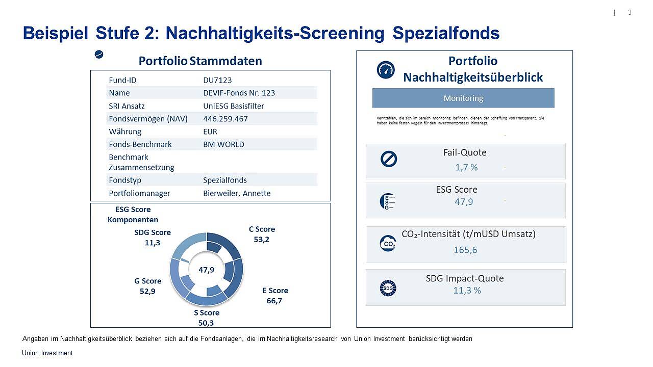 Darüber hinaus steigt regelmäßig die Nachfrage professioneller Anleger nach der Integration der sogenannten ESG-Kriterien (Environmental / Umwelt, Social / Soziales, Governance / Unternehmensführung) in ihr Anlagenportfolio. Die weitaus überwiegende Zahl der europaweit umgesetzten Ausschreibungsverfahren bei Kapitalanlagen verlangt die Integration von Nachhaltigkeitskriterien. Insbesondere in den letzten beiden Jahren hat auch die Nachfrage von Privatanlegern stark zugelegt. So entfallen aktuell knapp zwei Drittel des Nettoabsatzes bei Privatkunden auf nachhaltige Fondsprodukte von Union Investment.