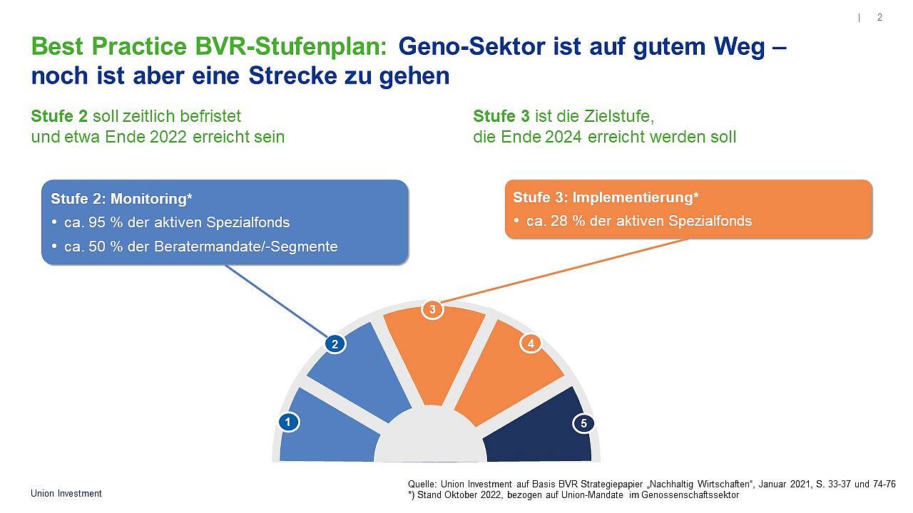Unser erklärtes Ziel ist es, alle genossenschaftlichen Eigenanlageportfolios im engen Dialog mit den Anlegern einer nachhaltigen Anlagestrategie zuzuführen. Hierzu haben wir unser Produktangebot bereits massiv verbreitert und bauen es immer weiter aus. Union Investment wendet dabei anspruchsvolle Standards an und wird diese ab Januar 2023 nochmals verschärfen. Damit wollen wir sicherstellen, dass unsere ESG-Strategie möglichst widerspruchsfrei als nachhaltig eingestuft werden kann.
