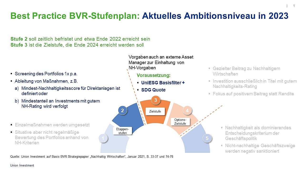 Für Genossenschaftsbanken bietet der Stufenplan des Bundesverbands der Deutschen Volksbanken und Raiffeisenbanken (BVR) eine gute Orientierung und Handlungsanleitung, das Thema Nachhaltigkeit in die Eigenanlagen zu integrieren – insbesondere auch für Fondsanlagen. Dieses praxisorientierte Konzept sorgt zudem für mehr Klarheit im Dickicht der Begrifflichkeiten. In unterschiedlichen Stufen beschreibt der BVR-Stufenplan verschiedene Ambitionsniveaus, die von den Banken pragmatisch und ohne zu viel Theorie in der Eigenanlage umgesetzt werden können.