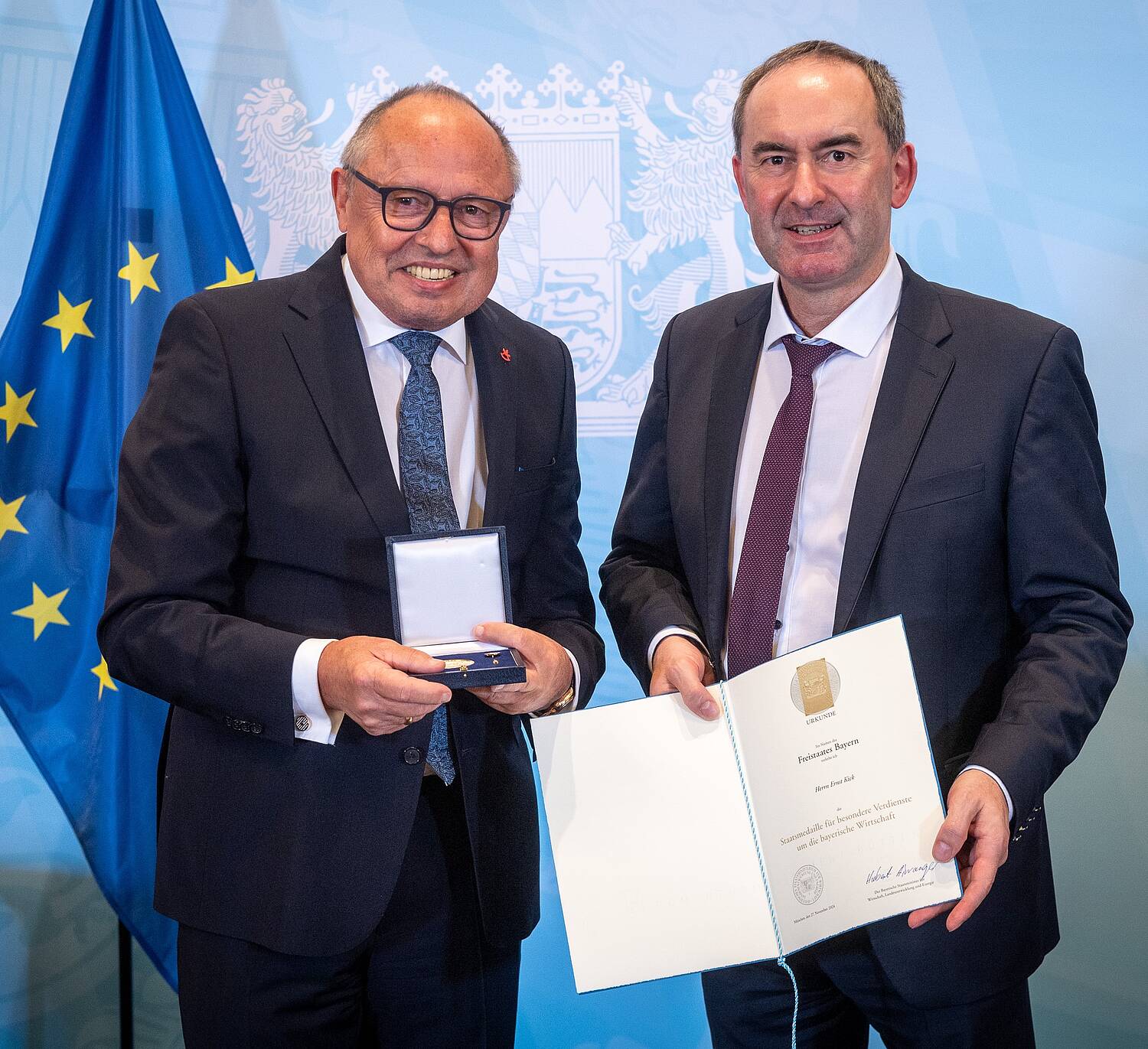 Der frühere langjährige Vorstandsvorsitzende der Spielwarenmesse, Ernst Kick, ist mit der Staatsmedaille für besondere Verdienste für die bayerische Wirtschaft ausgezeichnet worden. Die feierliche Verleihung fand am 27. November durch das Bayerische Staatsministerium für Wirtschaft, Landesentwicklung und Energie in München statt. Überreicht hat die Auszeichnung Bayerns Wirtschaftsminister Hubert Aiwanger. Er würdigte in seiner Laudatio vor allem die einmalige Position und herausragende Stärke der Spielwarenmesse. Zudem habe sie eine entscheidende Rolle in der Entwicklung der NürnbergMesse gespielt. Ernst Kick war von 2002 bis Juni 2021 Vorstandsvorsitzender der Spielwarenmesse. In seiner Amtszeit hat er die Nürnberger Genossenschaft vorangetrieben und die Leitfunktion der Spielwarenmesse ausgebaut. Zu Kicks wesentlichen Verdiensten zählten die Neuordnung der Messestruktur für einen komprimierten Marktüberblick. Außerdem arbeitete er intensiv an der Internationalisierung in wichtigen Wachstumsmärkten. Allein am Standort Nürnberg ist die Personalstärke unter seiner Leitung von 16 auf heute 60 Mitarbeiterinnen und Mitarbeiter gewachsen. Die heutigen Vorstände der Spielwarenmesse – Florian Hess, Jens Pflüger und Christian Ulrich (Sprecher) – gratulieren Ernst Kick im Namen des gesamten Teams herzlich zur Staatsmedaille.