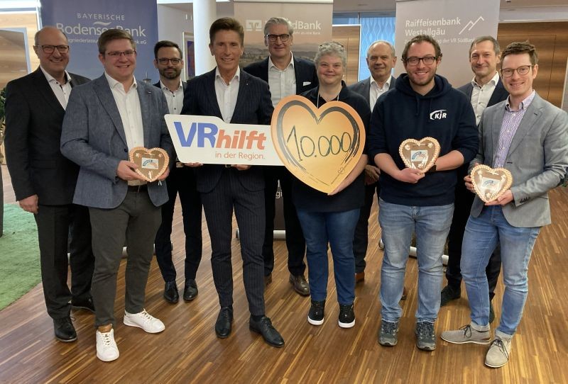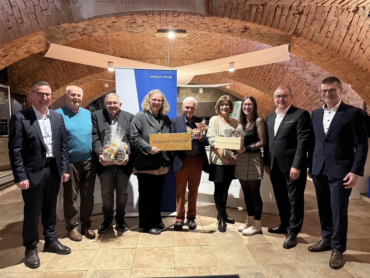Von links: Richard Oppelt, Vorstand VR-Bank, Eugen Lothert und Friedrich Müller vom Dorf-Taten-Konto, Almut Churavy und Dr. Helmut Rießbeck von GUSTL, Sabine Gün und Julia Mietzschke-Walz vom Kinderhaus Kunterbunt, Erwin Einzinger, stellvertretender Vorstandsvorsitzender VR-Bank und Dr. Gerhard Walther, Vorstandsvorsitzender VR-Bank.