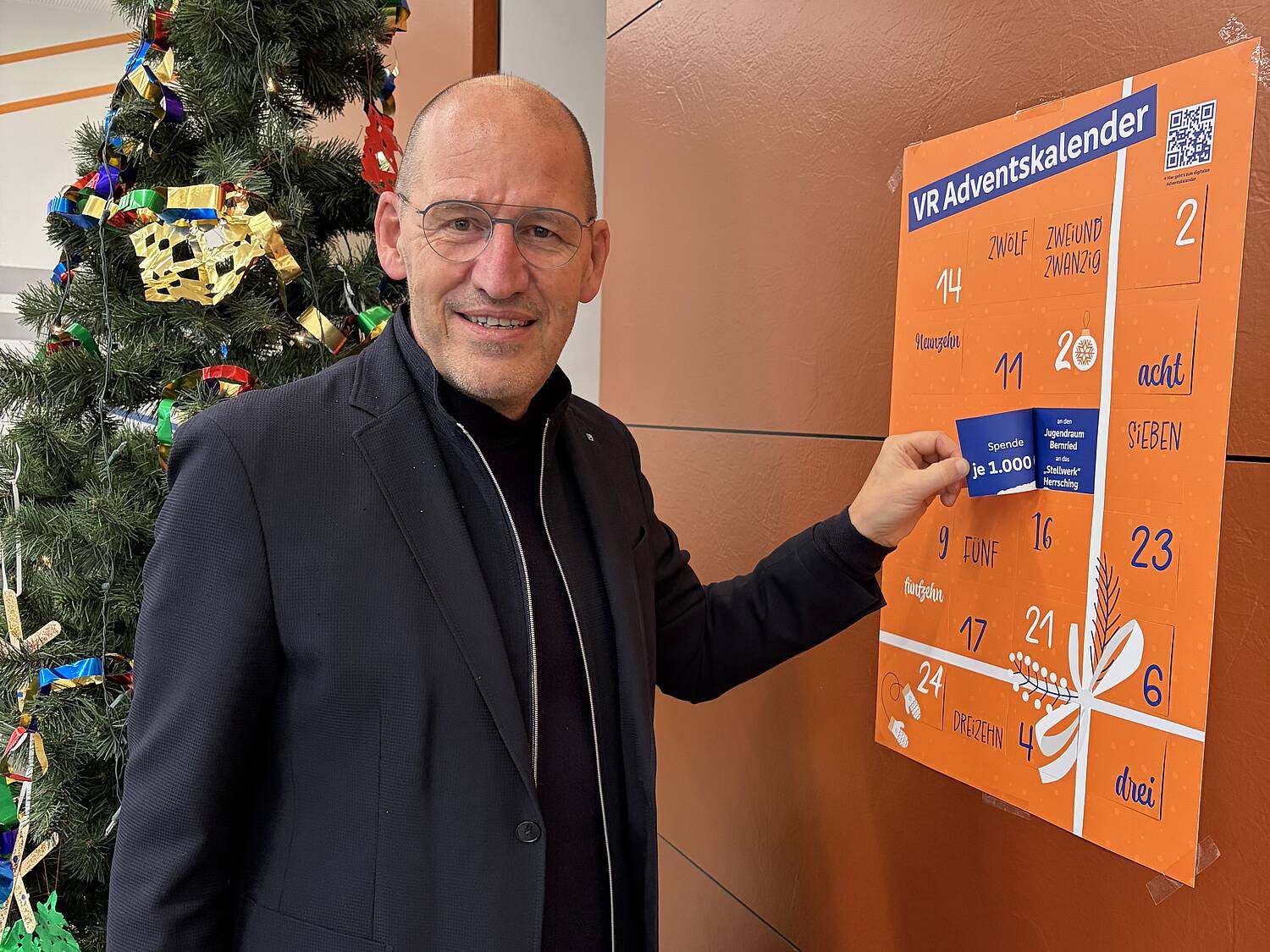 Vorstandsvorsitzender Thomas Vogl der VR Bank Starnberg-Zugspitze beim Öffnen des ersten Türchens in der Filiale Herrsching.
