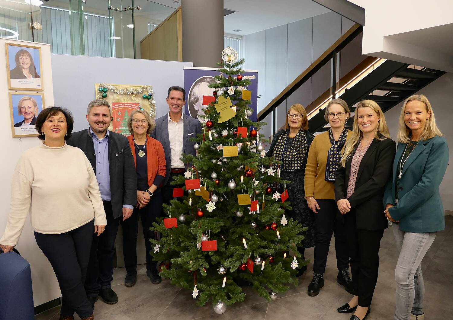 Der Wunschbaum brachte Freude zu Weihnachten: Astrid Vosseler von InnerWheel (v. l.), Bürgermeister und Schirmherr Stefan Korpan, Inner-Wheel-Präsidentin Britta Hecht, Stefan Hutter, Vorstand der VR Bank Starnberg-Zugspitze, Katrin Fügener und Katrin Fohlmeister-Zach von InnerWheel sowie Filialleiterin Nadja Dreißer und Monika Sägmüller, Servivebetreuung VR Bank.
