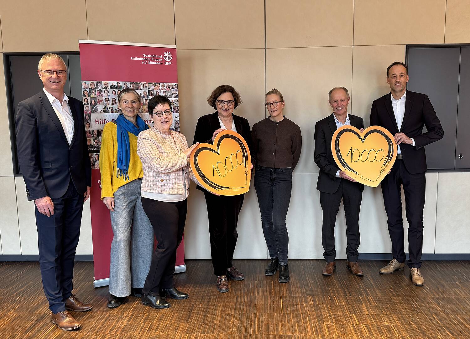Vorweihnachtliche Spendenübergabe: Franz Hofmann (v. l.), Vorstand des Gewinnsparvereins Bayern, Mechthild Laier und Heidi Rösler vom Sozialdienst katholischer Frauen München (SkF), Regina Wenninger (GVB und Vorstand Gewinnsparverein Bayern) und Irena Blome-Terhorst (SkF), Reinhard Schöttl vom VKKK Ostbayern und Dr. Alexander Leißl (GVB-Vorstand). Foto: GVB