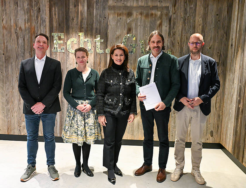 Fairness entlang der Lieferkette (v. li.): René Plasman (Geschäftsführer Rewe Group Buying), Landwirtin Veronika Spann, Landwirtschaftsministerin Michaela Kaniber, Bernhard Pointner (Geschäftsführer Molkerei Berchtesgadener Land) und Benjamin Wölk (Bereichsleiter Ware Penny-Discount Frische) feiern den Drei-Parteien-Vertrag. Foto: Judith Schmidhuber/StMELF
