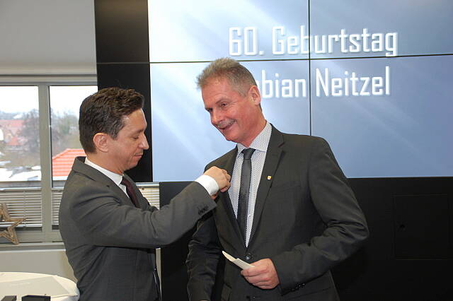 Fabian Neitzel, Vorstand der VR-Bank Feuchtwangen-Dinkelsbühl, ist Träger der Silbernen Ehrennadel des GVB. GVB-Regionalleiter Markus Graßer (li.) steckte ihm die Nadel zu seinem 25-jährigen Dienstjubiläum an. Der Aufsichtsratsvorsitzende Georg Habelt und der Vorstandsvorsitzende Christoph Glenk hoben in ihren Laudationes das persönliche Engagement von Neitzel für das mittelfränkische Kreditinstitut hervor.