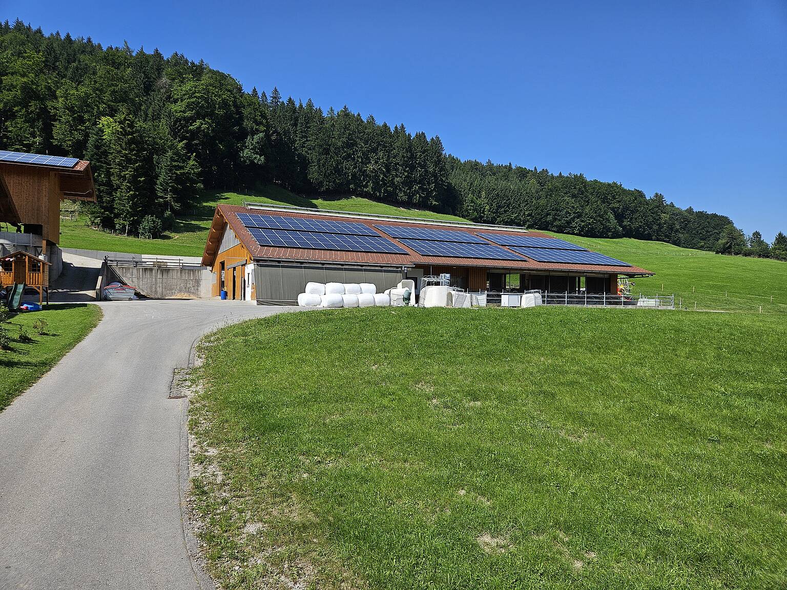 Der Laufstall auf dem Mayerhof in Samerberg von Bartholomäus Mayer. Auf dem Dach hat er eine Photovoltaik-Anlage mit 100 Kilowatt Leistung installiert.