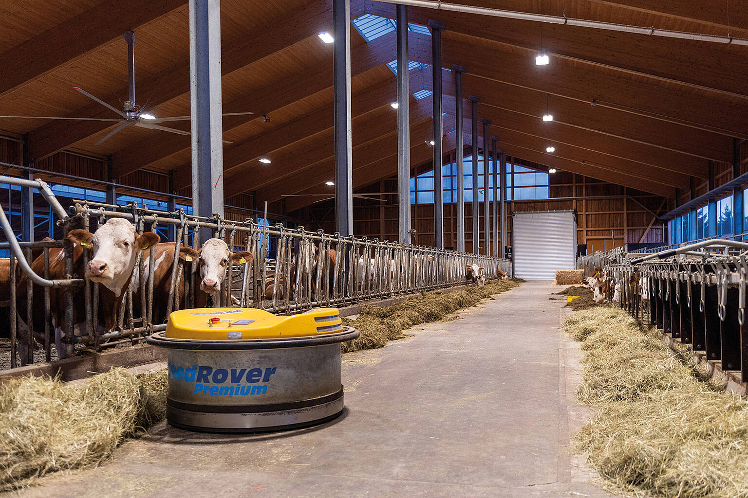Auch die Digitalisierung und Elektrifizierung der Fütterungstechnik wird durch das Programm Zukunftsbauer gefördert. Im Bild ein Futterschiebe-Roboter, der das Futter automatisch wieder zu den Kühen schiebt. Kühe neigen dazu, ihr Futter beim Fressen großflächig zu verteilen, sodass sie es am Ende nicht mehr erreichen können. Foto: Molkerei Berchtesgadener Land
