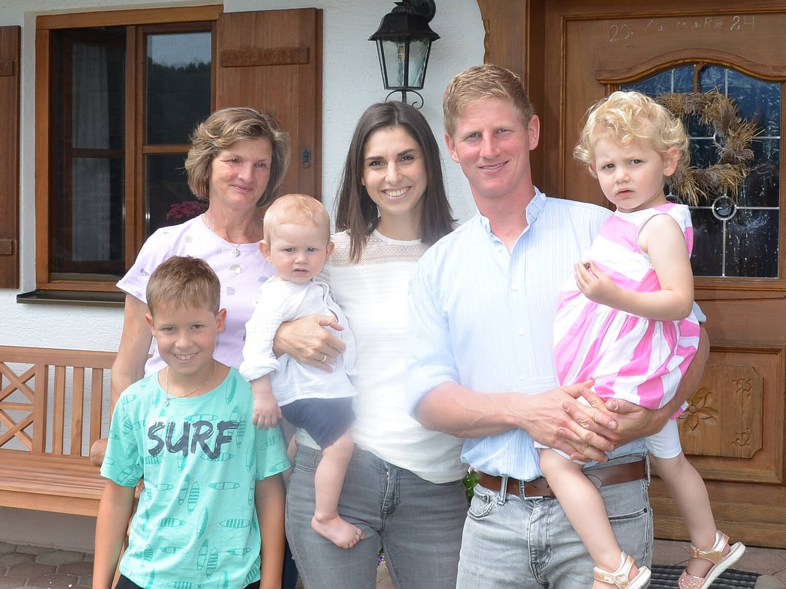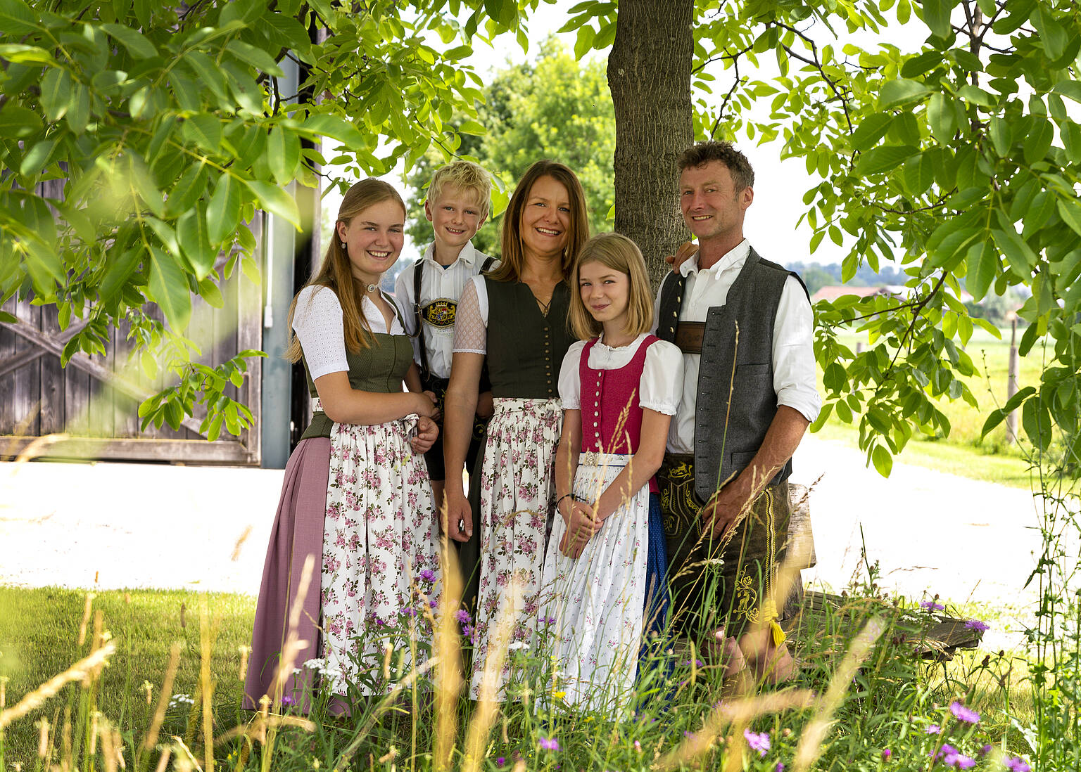Nachhaltigkeit liegt in der Natur der Landwirtschaft: Bartholomäus Mayer mit Ehefrau Elisabeth, Mutter Irmgard, Neffe Sebastian und den beiden Kindern Ludwig und Charlotte auf dem Mayerhof. Foto: Silvia Lehnert, Elite-Magazin