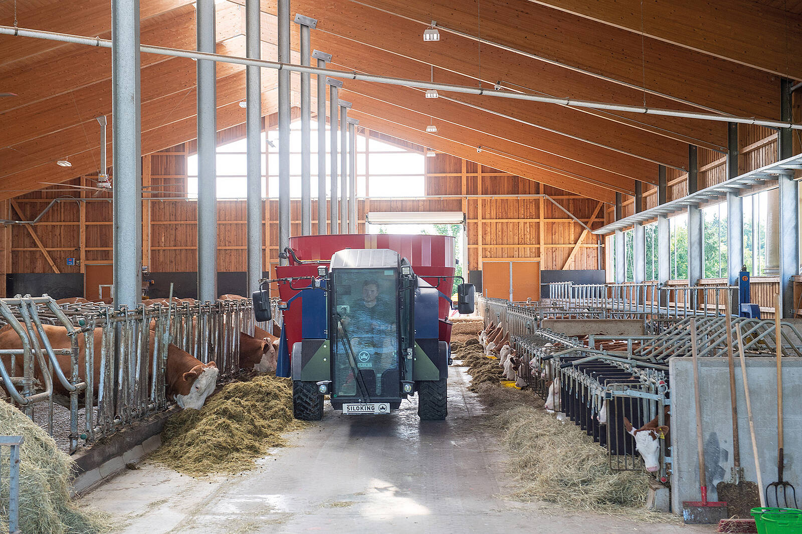Zudem nutzt Bartholomäus Mayer eigenes Quellwasser, um die Kühe zu tränken. Zuvor fließt das Wasser durch einen Wärmetauscher. So wird die Milch vorgekühlt, bevor sie in den Milchtank fließt, und das kalte Quellwasser für die Kühe wird auf eine angenehme Trinktemperatur erwärmt. Im Stall und bei den Maschinen setzt der Landwirt auf energiesparende Elektrotechnik. „Kuhbürste, Ventilatoren, Güllepumpe und Mistschieber werden alle elektrisch betrieben, zudem haben wir den Stall auf LED-Beleuchtung umgerüstet. Weil wir zusätzlich den PV-Strom zwischenspeichern können, kommen wir beim Strom auf eine Eigenverbrauchsrate von 70 bis 75 Prozent“, berichtet Mayer.