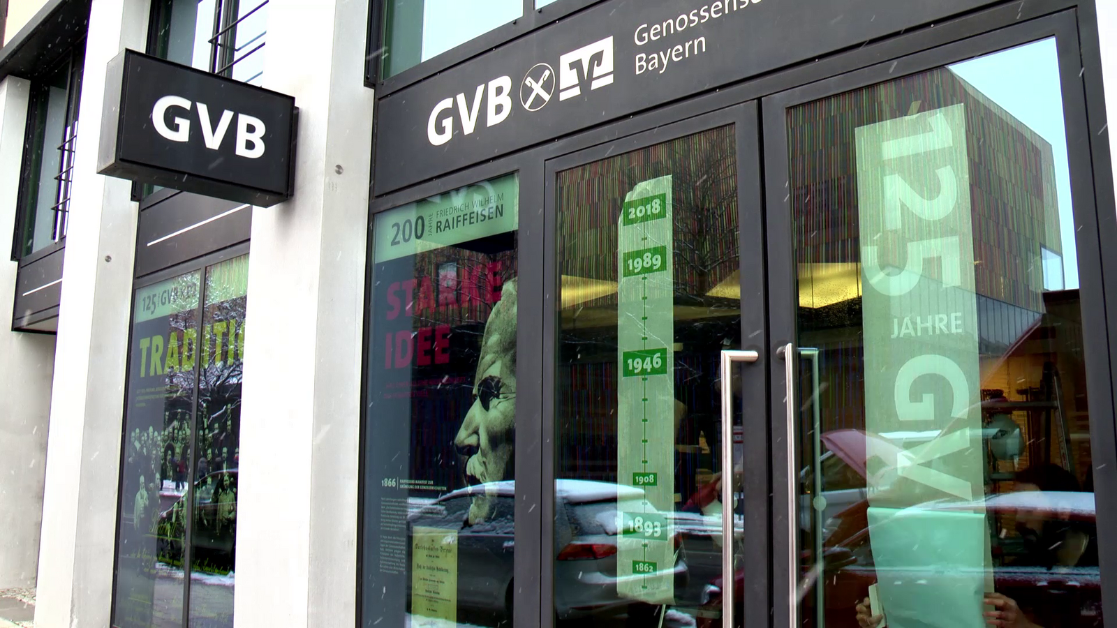 125 Jahre, 11 Fenster: Ein Video zeigt die Plakatierung der Fassade der Münchner Zentrale des Genossenschaftsverbands Bayern (GVB).