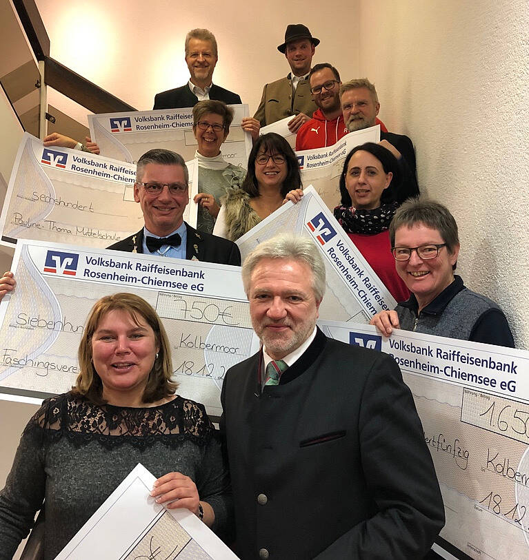 Die Volksbank Raiffeisenbank Rosenheim-Chiemsee hat acht Vereine der Stadt Kolbermoor (Landkreis Rosenheim) mit insgesamt 6.500 Euro unterstützt. Das Geld ging an die Fußballjugend und Skiabteilung des Sportvereins DJK, die Schäffler, die Nachbarschaftshilfe, die AWO, die Tafel, das Heimatmuseum und den Förderverein der Pauline-Thoma-Schule. Wolfgang Klinghuber, Leiter der Hauptgeschäftsstelle Kolbermoor, überreichte die symbolischen Schecks an die Vertreter der Vereine. Die Mittel für die Spende stammen aus dem Reinertrag des Gewinnsparens.