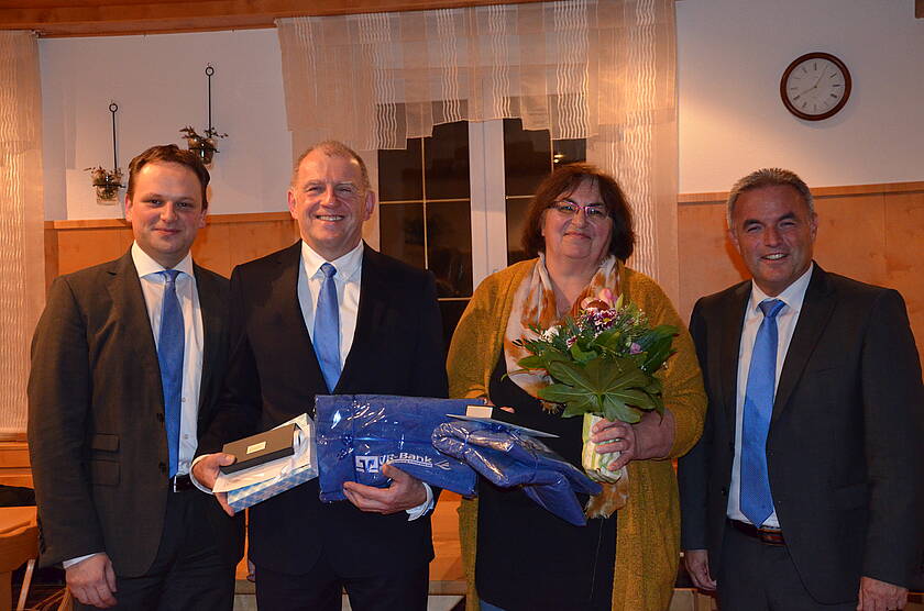 Mit Antonie Holl und Martin Wegele hat die VR-Bank Landsberg-Ammersee zwei langjährige Mitarbeiter in den Ruhestand verabschiedet. Vorstandsvorsitzender Stefan Jörg, Vorstandsmitglied Martin Egger sowie die von den frischgebackenen Ruheständlern eingeladenen Kolleginnen und Kollegen kamen im Gasthof zur Brücke in Kaufering zusammen, um den Abschied zu feiern. Stefan Jörg bezeichnete den Eintritt der beiden Geehrten in den Ruhestand als Ende einer Ära bei der VR-Bank Landsberg-Ammersee. Immerhin blicken Antonie Holl auf 38 Jahre und Martin Wegele auf 46 Jahre Betriebszugehörigkeit zurück. Im Namen des Vorstands sowie allen Mitarbeiterinnen und Mitarbeitern bedankte sich Jörg bei den beiden für ihre langjährige Mitarbeit und Treue und überreichte jeweils ein kleines Präsent.
