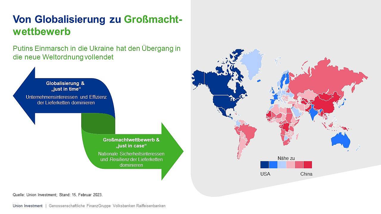 Frank Engels: Der Krieg in Osteuropa hat nicht nur Zehntausende Menschenleben gefordert und enorme Schäden verursacht – er hat auch den Übergang in eine neue Weltordnung vollendet. Auf die Globalisierung folgt nun der Großmachtwettbewerb um die weltweite Vormachtstellung zwischen den USA und China. Diese neue Ära der „Great Transformation“ wird unserer Einschätzung nach in den kommenden Jahren das Kapitalmarktumfeld maßgeblich prägen und Anlageentscheidungen unmittelbar beeinflussen.