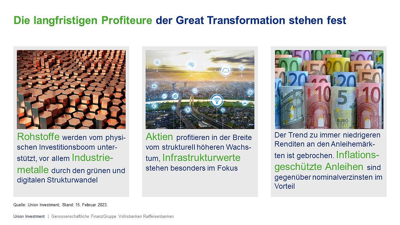 Engels: Im Jahr 2023 dürfte sich die Gesamtinflation zwar weltweit abschwächen, ein nachhaltiger Rückgang auf Niveaus von vor Ausbruch der Coronapandemie ist aber zumindest bei der Kerninflation nicht zu erwarten. Denn in der „Great Transformation“ wirken mehrere Trends strukturell inflationstreibend. Der Investitionsboom bei Infrastruktur und neuen Produktionsstrukturen wird die gesamtwirtschaftliche Nachfrage befeuern, und nicht immer wird das Angebot Schritt halten können. In diesen Fällen wird der Markt über steigende Preise ins Gleichgewicht gebracht werden müssen. Zudem werden Unternehmen nach den Erfahrungen von Pandemie und Ukrainekrieg der Sicherheit ihrer Lieferketten besondere Bedeutung zumessen – im Zweifel auch um den Preis höherer Kosten. Das Kriterium der Sicherheit und Stabilität dürfte mittelfristig deutlich an Bedeutung gewinnen. Kurzum: Resilienz schlägt Effizienz.