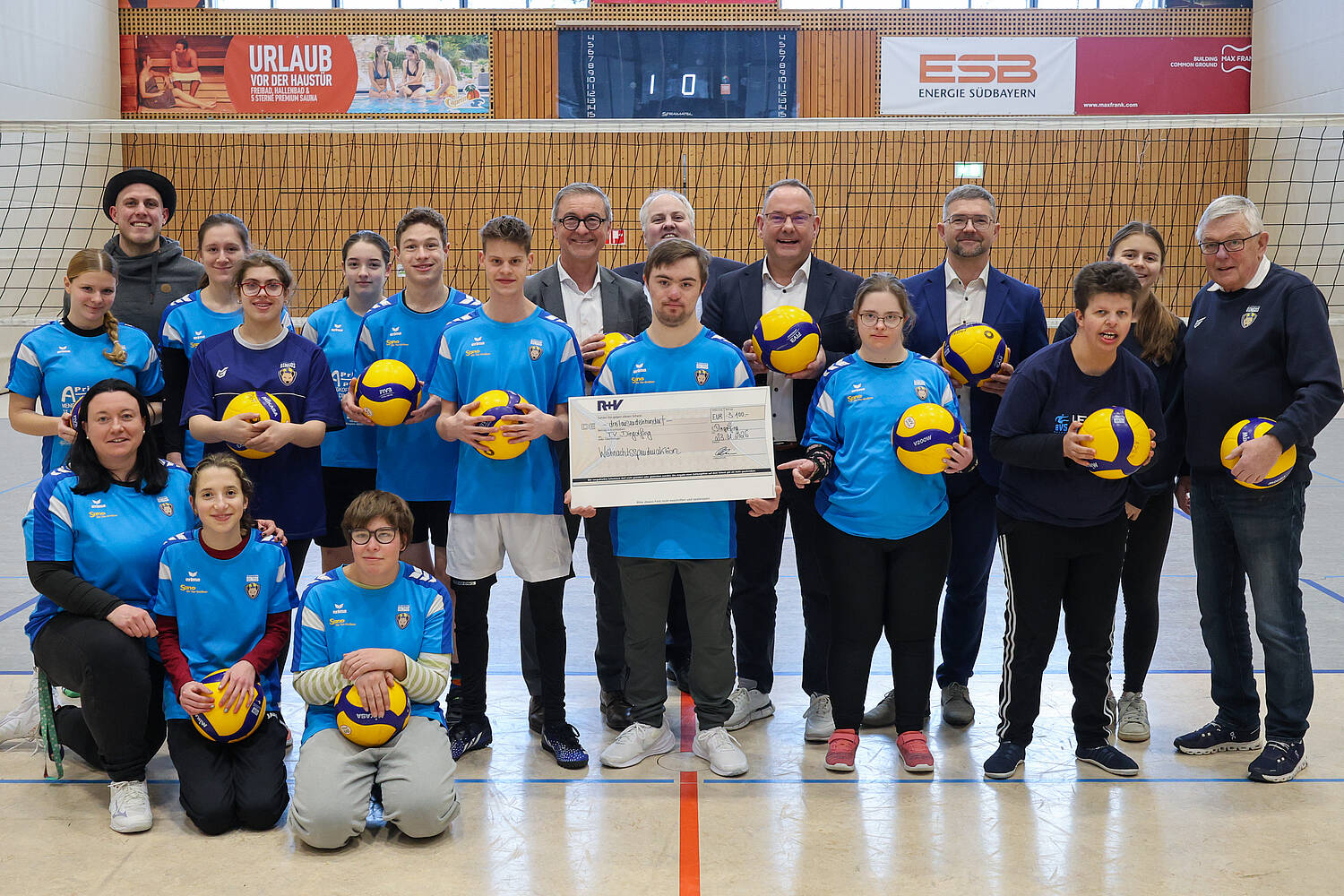 Im Januar fand die Spendenübergabe aus der Weihnachtsspendenaktion der R+V beim TV Dingolfing, Abteilung Inklusionsgruppe Volleyball, statt. Vor Ort waren Josef Wenninger, Vorstand der VR-Bank Ostbayern-Mitte, Kunden- und Bezirksdirektor Michael Buchschmid und Paul Janoschka, Mitglied des regionalen Betriebsrates. Toni Kiebler, Vorstand des TV Dingolfing, und alle Beteiligten bedankten sich für das Spendenergebnis in Höhe von 3.100 € – für gelebte Inklusion, Teamgeist und gesellschaftlichen Zusammenhalt. Der TV Dingolfing hat die einzige Inklusionsgruppe Volleyball in einem Verein in Bayern. Es spielen und trainieren Jugendliche mit und ohne Handicap Volleyball. Auch nicht ohne Erfolg, denn die beiden Vierer-Mannschaften des TVD gewannen beim Special Olympic Landesfinale im Beachvolleyball in Erlangen Silber und Bronze und qualifizierten sich somit für die German Olympic Games im Juni 2026 in Saarbrücken. Der TV Dingolfing hat zudem eine weitere Inklusionsgruppe: „Spielen mit dem Ball“ für Kinder. Beide Gruppen wurden vom m Bayerischen Behinderten- und Rehabilitationsverband (BVS) mit dem EiSS-Siegel „Erlebte Inklusive Sportschule“ ausgezeichnet. Ein weiterer Ausbau des Inklusionssports ist geplant.