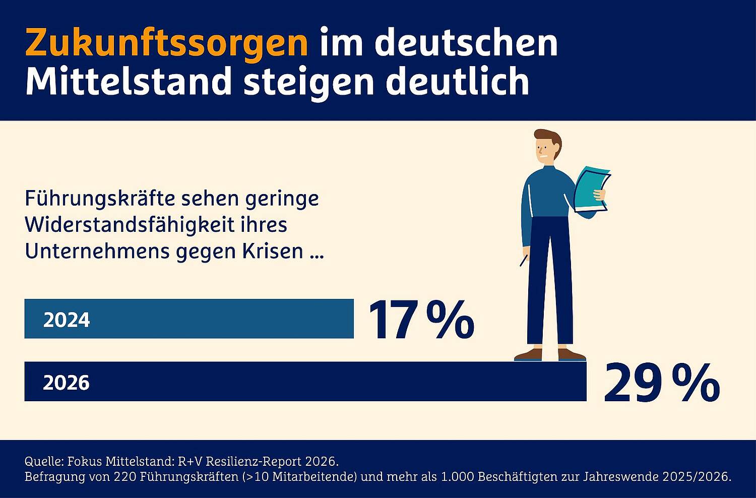 Für die „Fokus Mittelstand: R+V Resilienz-Report 2026“ wurden zur Jahreswende 2025/26 mehr als 220 Führungskräfte und über 1.000 Beschäftigte befragt.