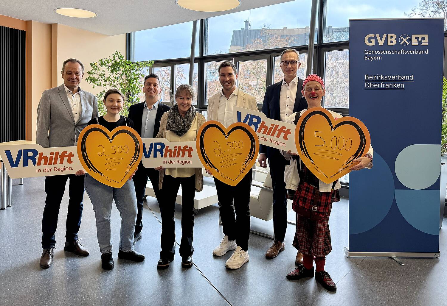Im Februar wurde in den Räumlichkeiten der VR Bank Bamberg-Forchheim die Bezirksspende Oberfranken, insgesamt 10.000 Euro, an drei soziale Projekte übergeben. „Wer ein Los kauft, entscheidet sich immer auch für die Region. Der soziale Aspekt ist das Fundament, auf dem wir seit Jahrzehnten bauen“, sagte Markus Eichenseer, Geschäftsführender Vorstand VR Gewinnsparverein Bayern. Dieses Engagement sei heute wichtiger denn je. So ergänzte Joachim Hausner, GVB-Bezirkspräsident Oberfranken und Vorstandsvorsitzender der VR Bank Bamberg-Forchheim: „Die Spendenanfragen steigen spürbar, da soziale Leistungen von staatlicher Seite leider zunehmend zurückgefahren werden.“ Umso bedeutender sei es, dass 17 oberfränkische Volks- und Raiffeisenbanken gezielt Projekte identifiziert haben, die dort ansetzen, wo Hilfe am dringendsten benötigt wird. Die Spendensumme von 10.000 Euro wurde auf drei Institutionen verteilt: 2.500 Euro gingen an den KJR Bamberg-Land. Das Geld fließt direkt in die Inklusion, konkret in den Aufbau einer barrierefreien Website. Ziel ist es, allen jungen Menschen, unabhängig von körperlichen oder geistigen Einschränkungen, einen einfachen Zugang zur Jugendarbeit im Landkreis zu ermöglichen. Weitere 2.500 gingen an Palliativmedizin ist Lebensmedizin. Der Verein setzt dort an, wo Heilung nicht mehr möglich, aber Lebensqualität entscheidend ist. Der Fokus liege auf der Trauerbegleitung für An- und Zugehörige, sowie der Fort- und Weiterbildung. Die KlinikClowns Bayern, die bayernweit jährlich rund 3.500 Einsätze leisten, freuten sich über 5.000 Euro. Ob in Altenheimen oder Kinderkliniken: Ihr Ziel ist es, die Atmosphäre zu verändern, den Fokus weg von der Krankheit und hin zum Spiel, zur Musik und zum Tanz zu lenken.