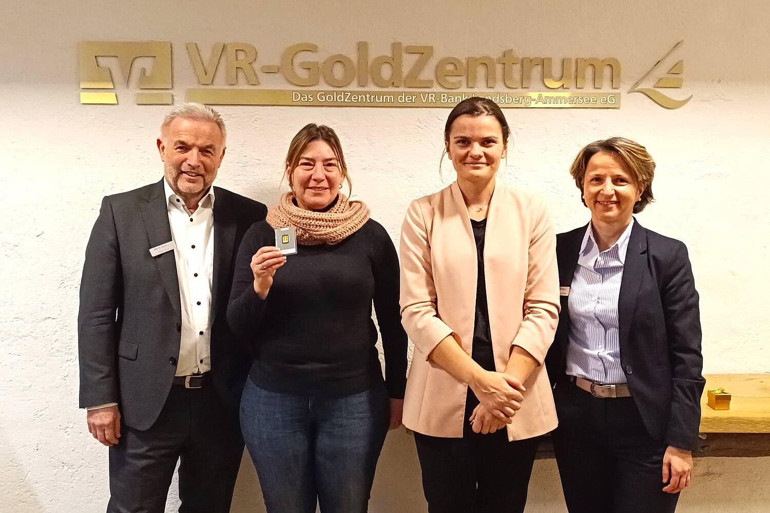 Vorstandsvorsitzender Stefan Jörg (v. l.), Goldgewinnerin Gisela Demleitner, Leiterin des VR-GoldZentrums Maria Pigola und VR-Finanzplanerin Ümran Celebioglu bei der Goldübergabe.