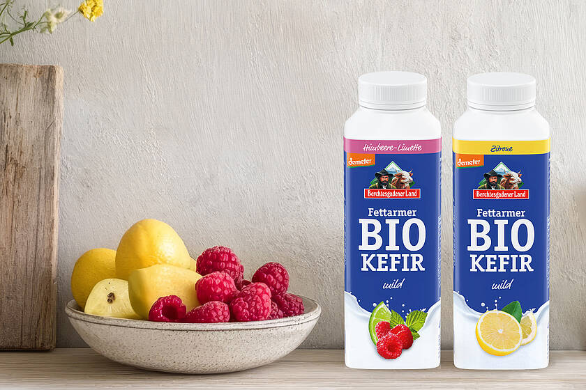 Demeter Fettarmer Bio-Kefir mild von Berchtesgadener Land gibt’s ab April neu in den Sorten Himbeere-Limette und Zitrone. Foto: Molkerei Berchtesgadener Land