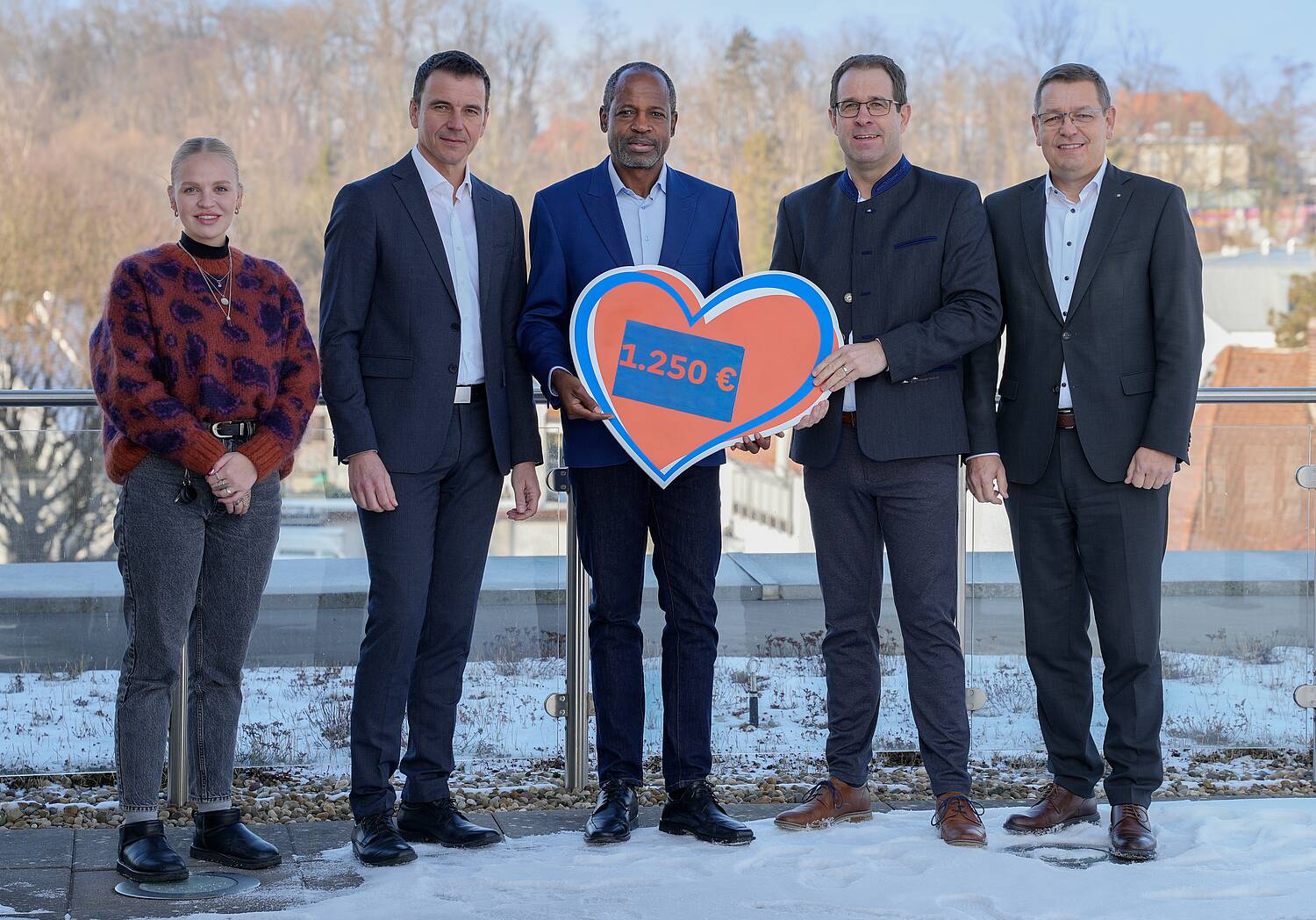 Samuel Fosso (Mitte) mit Pressereferentin Alena Gula, Betriebsratsmitglieder Christian Ziegltrum, und Markus Popp sowie Vorstand Bernhard Nickel von der Freisinger Bank. Foto: Freisinger Bank
