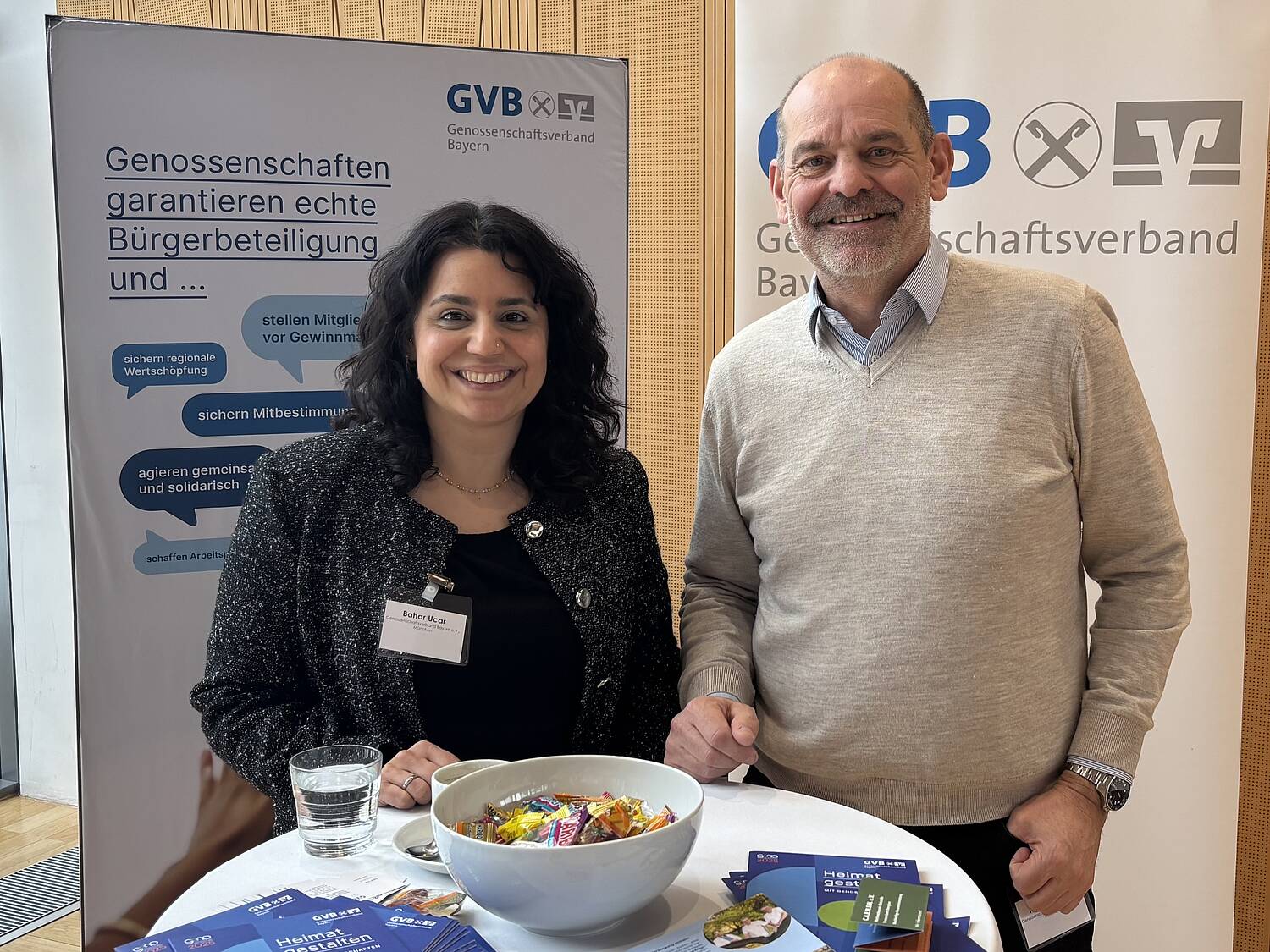 Bahar Ucar und Hilmar Ulrich vom Genossenschaftsverband Bayern informieren über genossenschaftliche Beteiligungsmodelle bei der Umsetzung regionaler Energieprojekte.