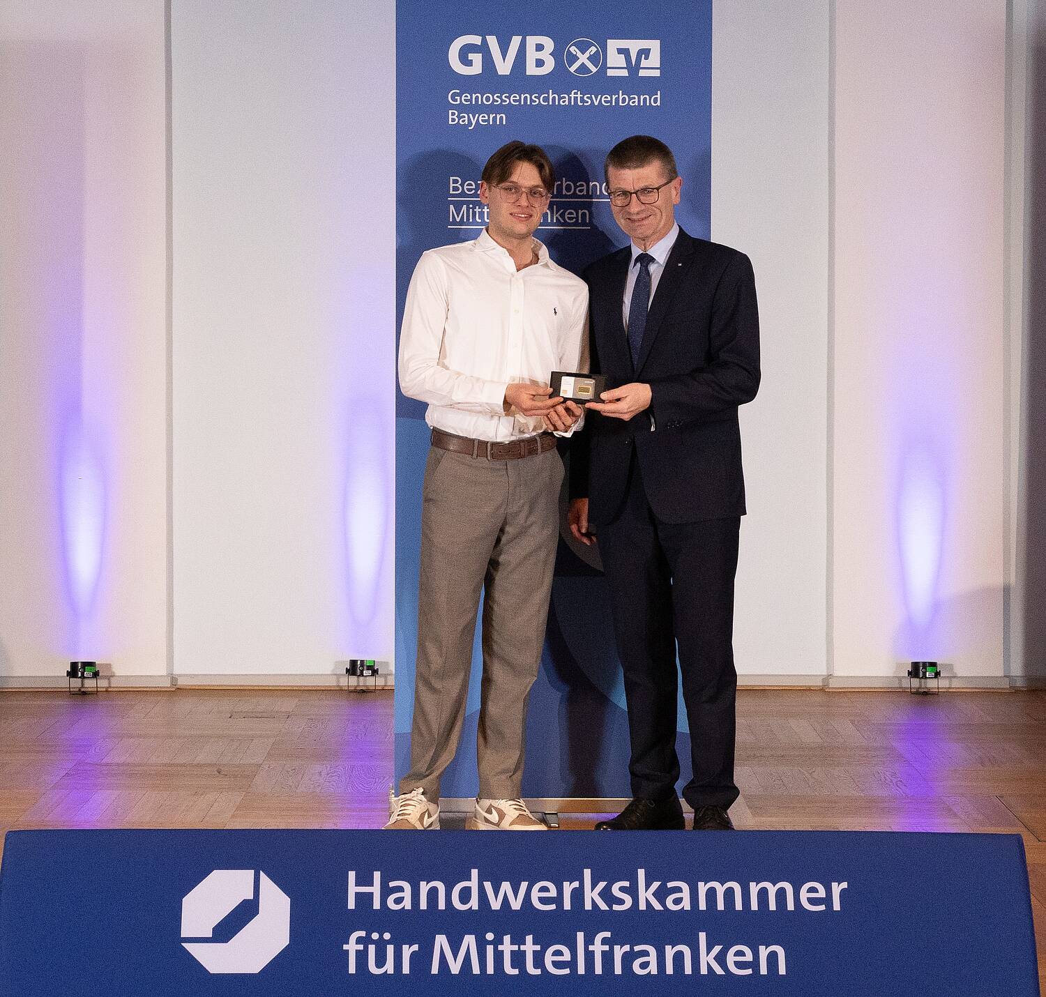 Der Bundessieger der German Craft Skills, Niklas Koch (l.), erhielt von Dr. Gerhard Walther, Vorstandsvorsitzender der VR-Bank Mittelfranken Mitte, einen Goldbarren.