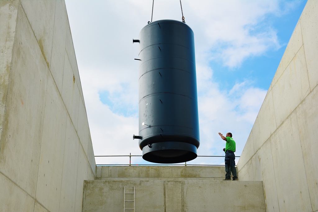 Ein großer Pufferspeicher wird in das Heizhaus der Nahwärme Ettenstatt eG eingebaut (Bild aus dem Jahr 2023): Entscheidend dafür, dass aus der Planung eine erfolgreiche und nachhaltige Wärmeversorgung entsteht, ist die Verankerung vor Ort und die Gestaltung gemeinsam mit relevanten Akteuren. Foto: Enerpipe