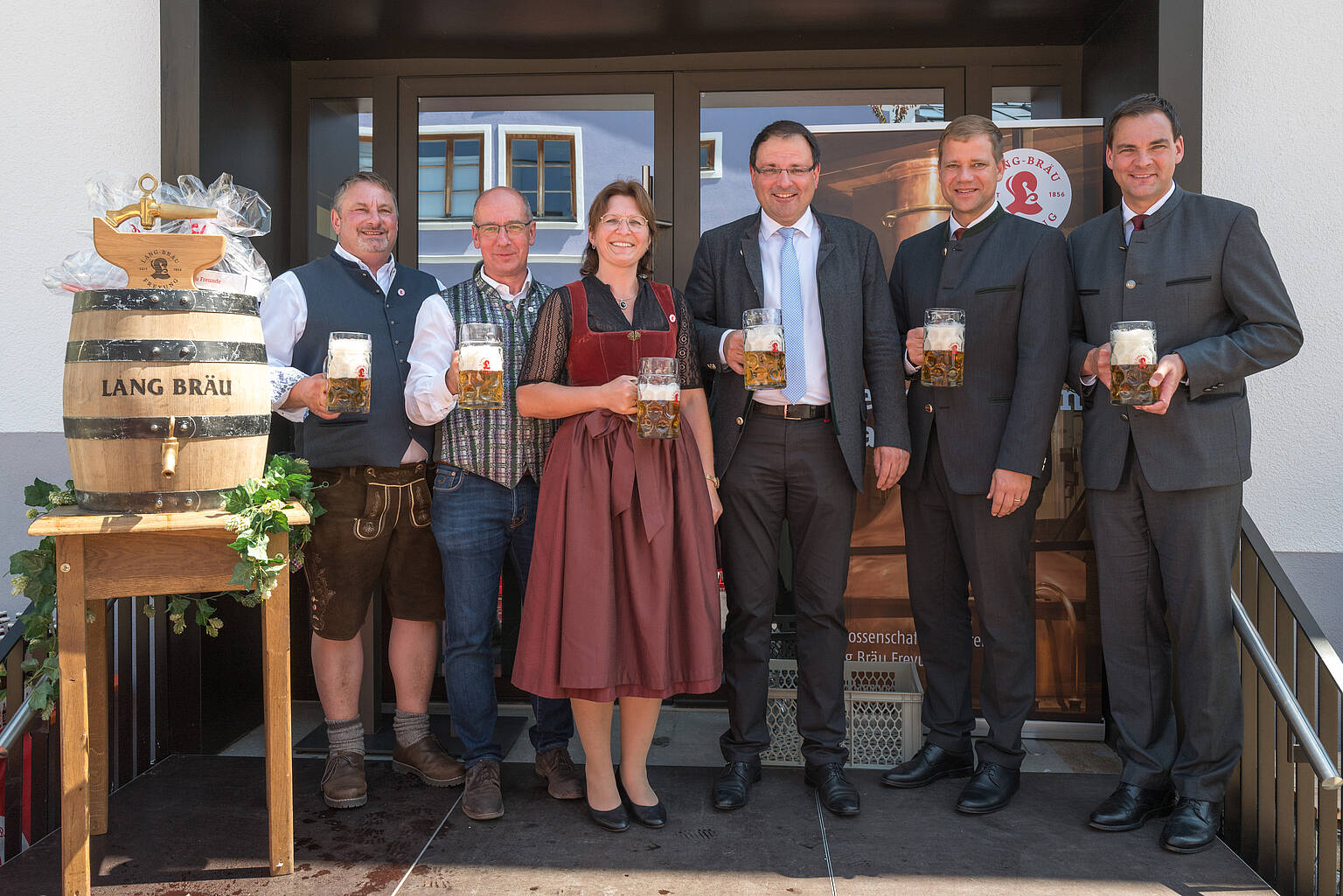 Ein Prost auf eine erfolgreiche Genossenschaftsbrauerei (v. li.): Rudi Bauer, Anton Pertler und Bettina Schmutzer, Vorstände der Lang Bräu Freyung eG, Martin Schöffel, Staatssekretär im Bayerischen Finanz- und Heimatministerium sowie gelernter Brauer und Mälzer, Freyungs Erster Bürgermeister Olaf Heinrich und Sebastian Gruber, Landrat des Landkreises Freyung-Grafenau. Foto: Lang Bräu Freyung eG