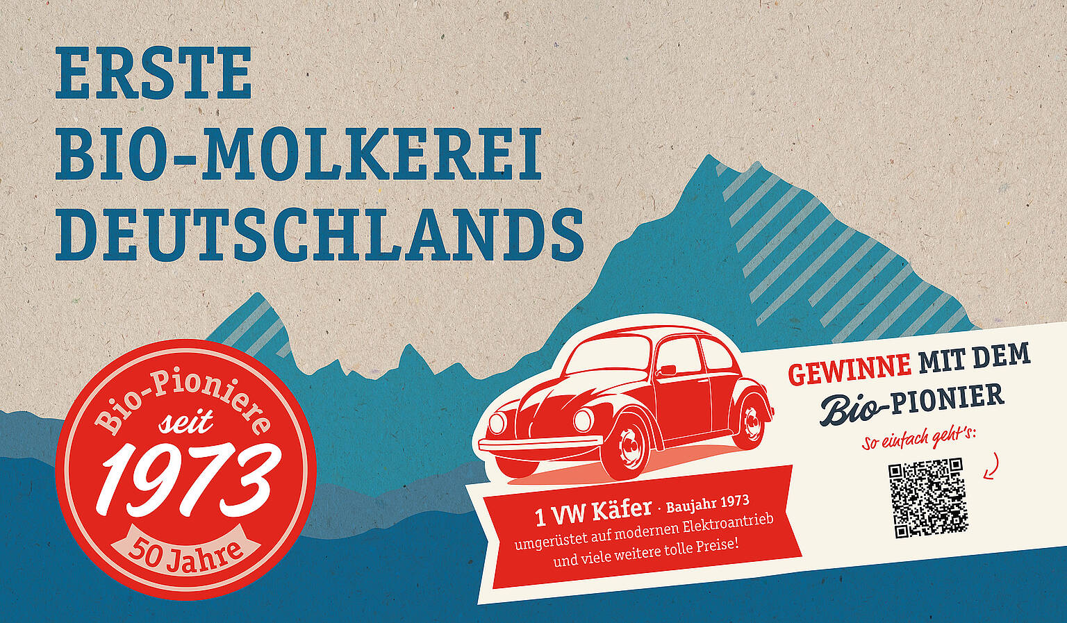 Mit einem Gewinnspiel macht die Molkerei Berchtesgadener Land auf ihr 50. Bio-Jubiläum aufmerksam. Zu gewinnen gibt es unter anderem einen auf Elektroantrieb umgerüsteten VW-Käfer. Foto: Molkerei Berchtesgadener Land