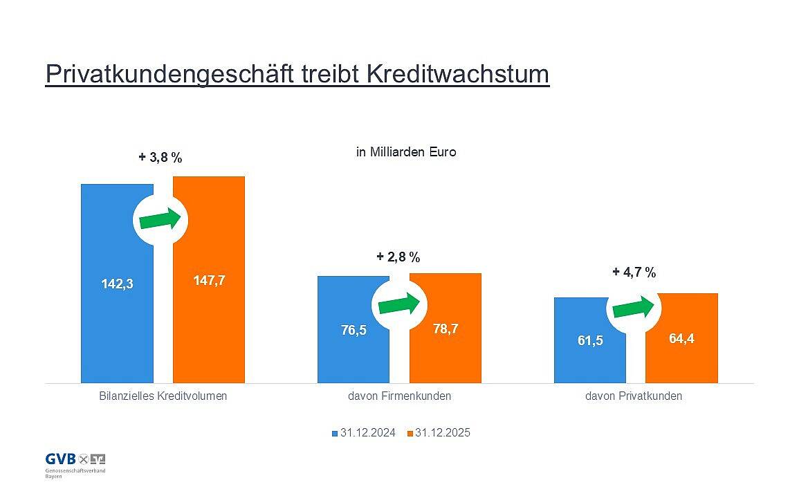 Das Kreditvolumen bei Firmenkunden stieg um 2,8 Prozent beziehungsweise 2,1 Milliarden Euro und damit langsamer als im Vorjahr. Nach Einschätzung von GVB-Vorstandsmitglied Alexander Leißl spiegelt dies die konjunkturelle Schwäche sowie die Zurückhaltung vieler Unternehmen wider.