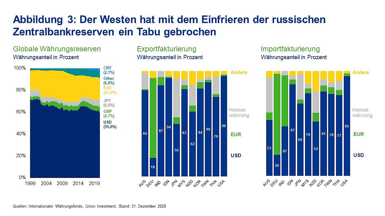 Mit dem Einfrieren eines Teils der russischen Währungsreserven und dem Ausschluss mehrerer russischer Banken vom internationalen Zahlungssystem SWIFT wurde ein Tabu gebrochen. Für den US-Dollar, der immer noch fast 60 Prozent der weltweiten Devisenreserven ausmacht, dürften die aktuellen Entwicklungen langfristig eine Zeitenwende markieren. Denn die Botschaft hinter den Sanktionen ist auch für andere Länder deutlich: In einem Konflikt mit dem Westen sind Devisenreserven in westlichen Währungen im Zweifelsfall wertlos.