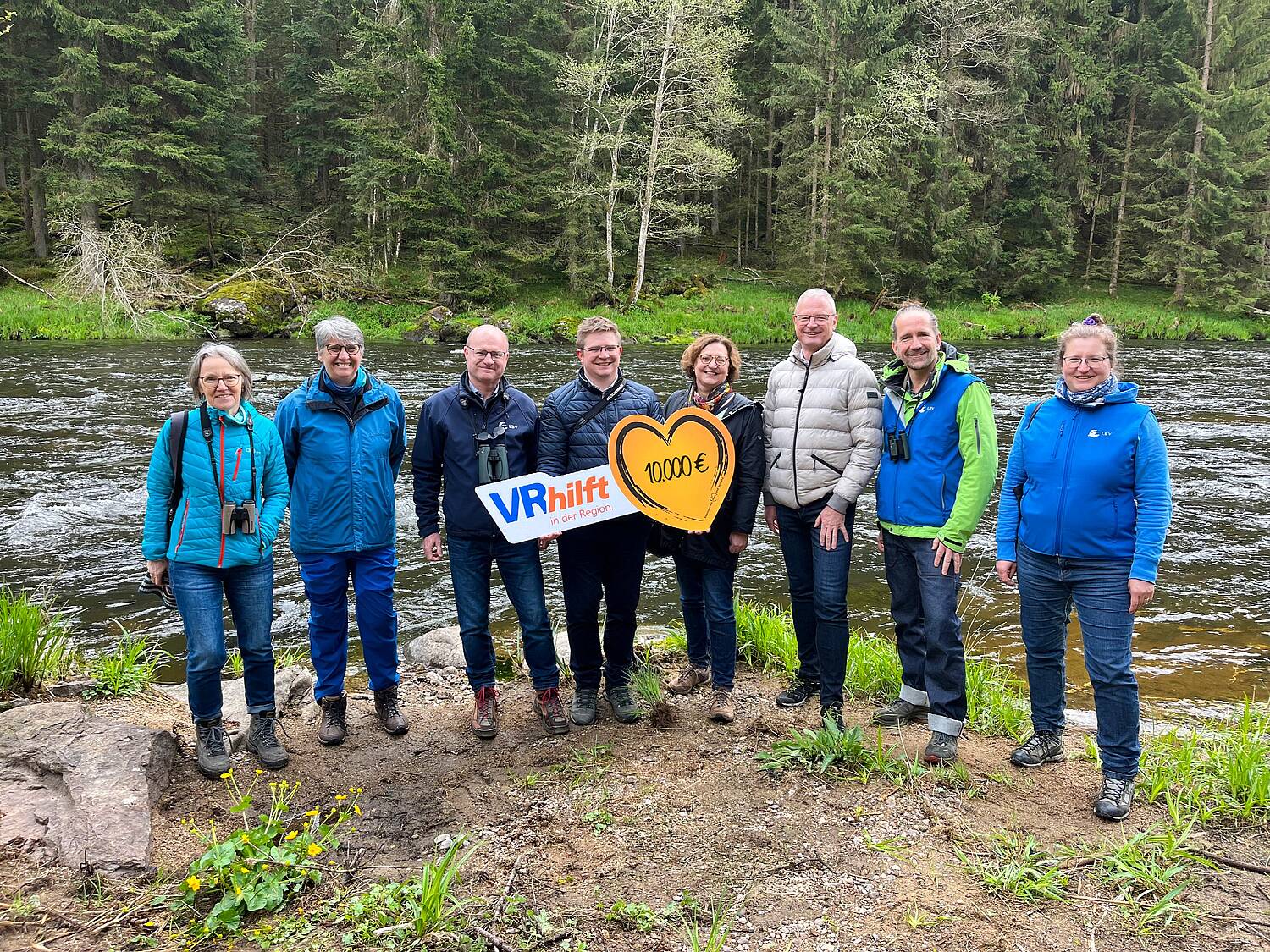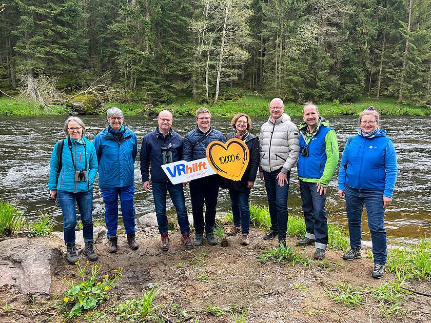 Spendenübergabe am Schwarzen Regen (v. li.): Rosmarie Wagenstaller und Dorothea Haas (beide Kreisgruppe Regen LBV), Norbert Schäffer (Vorsitzender LBV), Christian Homeier (geschäftsführender Vorstand Gewinnsparverein), Regina Wenninger (Vorständin Gewinnsparverein), Franz Hofmann (Vorstandsvorsitzender Gewinnsparverein), Alf Pille (Geschäftsführer LBV) sowie Malvina Hoppe (Projektleiterin LBV).