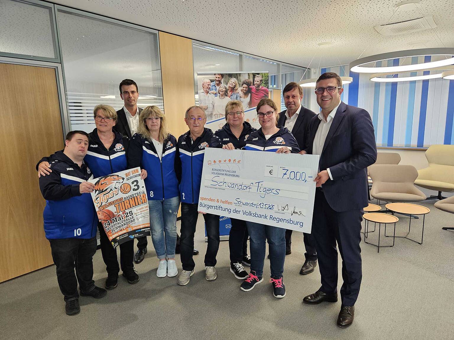 Bei der inklusiven Basketballgruppe des TSV 1880 Schwandorf trainieren Menschen mit und ohne Behinderung gemeinsam – und das sehr erfolgreich. Das Team qualifiziert sich regelmäßig für Turniere auf Landes- und Bundesebene. „Wir freuen uns riesig, wenn wir etwa zu den Special Olympics fahren dürfen. Doch die Teilnahme ist mit hohen Kosten verbunden“, erzählt Gisbert Gotz, Gründer und Initiator der Schwandorf Tigers. Um solche Reisen zu ermöglichen, hat die Bürgerstiftung der Volksbank Regensburg, die heute zur Volksbank Raiffeisenbank Regensburg-Schwandorf gehört, vergangenes Jahr 7.000 Euro gespendet.