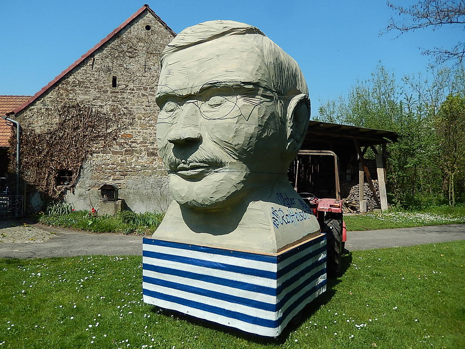 Ruppert: 2002 organisierte der örtliche Weinbauverein zum 25-jährigen Bestehen seines Weinfests einen Festumzug. Die Raiffeisenbank am Schwanberg war als Genossenschaft stark im Dorfleben verwurzelt und so wurde ich gefragt, ob wir uns an der Parade beteiligen möchten. Ich habe natürlich ohne zu überlegen zugesagt, zumal die Bank 2002 selbst ein großes Jubiläum zu feiern hatte: ihren 125-jährigen Geburtstag. Obwohl ich Personenkult eigentlich ablehne, kam mir die Idee, Friedrich Wilhelm Raiffeisen möglichst prägnant auf einem Festwagen zu präsentieren. Doch das „Wie“ bereitete mir zahlreiche schlaflose Nächte. Irgendwann kam mir dann ein Geistesblitz: Wir machen eine große Büste des Gründervaters.