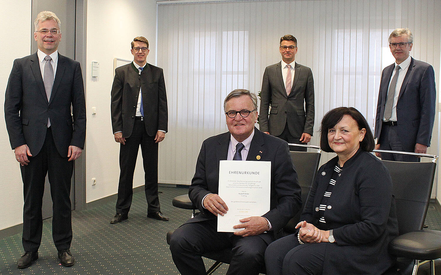 Nach der Ehrung (v. li.): Alexander Büchel (Vorstand GVB), Bernhard Failer (Vorstand Raiffeisen-Volksbank Ebersberg), Rudolf Heiler (Aufsichtsratsvorsitzender Raiffeisen-Volksbank Ebersberg), Christian Weber (Vorstand Raiffeisen-Volksbank Ebersberg), Ingrid Heiler (Ehefrau) und Martin Neumayer (stellvertretender Aufsichtsratsvorsitzender Raiffeisen-Volksbank Ebersberg).