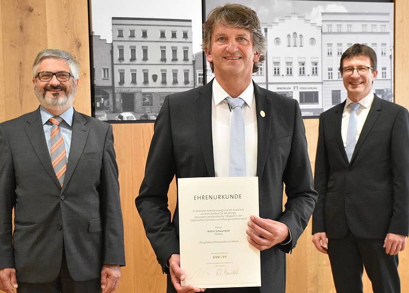 Mit Goldnadel und Ehrenurkunde (v. li.): Franz Penker (Regionaldirektor GVB), Anton Schaumeier (Vorstandsvorsitzender) und Walter Deinböck (Aufsichtsratsvorsitzender, beide VR-Bank Isar-Vils). Foto: Georg Soller, Vilsbiburger Zeitung