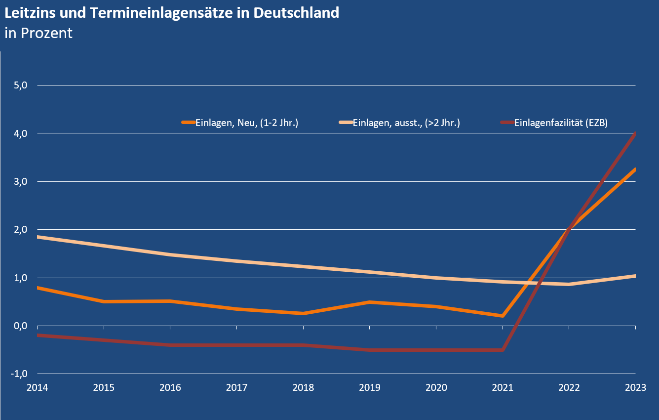 Der steile Zinsanstieg hat zu einer neuen Attraktivität festverzinslicher Einlagen geführt. Neue Einlagen mit einer Laufzeit von ein bis zwei Jahren werden gegenwärtig um 2 Prozentpunkte besser verzinst als langfristige bestehende Einlagen aus der Niedrigzinsphase. 2021 waren die langfristigen Bestandseinlagen noch um 0,7 Prozentpunkte mehr verzinst worden, damit aber immer noch rund 2 Prozentpunkte schlechter als die ein- bis zweijährigen Neueinlagen jetzt.