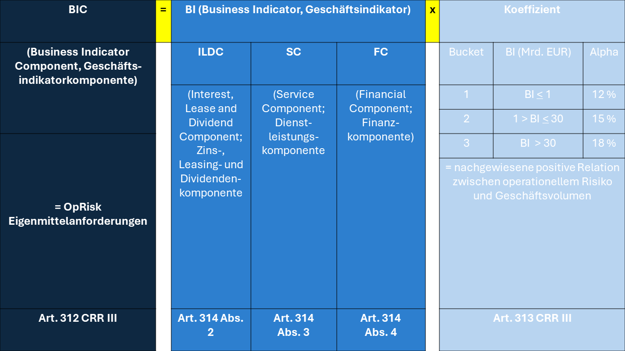 Die Regelungen zur Berechnung der operationellen Risiken wurden in der CRR III komplett überarbeitet. Anstatt der aktuell drei Berechnungsmethoden (Basisindikatoransatz, Standardansatz und Advanced Measurement Approach) wird es künftig nur noch ein Verfahren zur Berechnung der Eigenmittelunterlegung geben. Ab 1. Januar 2025 ersetzt der neue Standardansatz alle bestehenden CRR-Ansätze und gilt für alle Institute. Die Mindesteigenmittelanforderungen für das operationelle Risiko im neuen Standardansatz ergeben sich im ersten Schritt durch die Berechnung einer sogenannten Geschäftsindikatorkomponente (Business Indicator Component, BIC). Diese wird auf Grundlage der Höhe des Geschäftsindikators (Business Indicator, BI) eines Instituts und drei gesetzlich definierter Größenklassen (Bucket 1, 2 und 3) ermittelt.