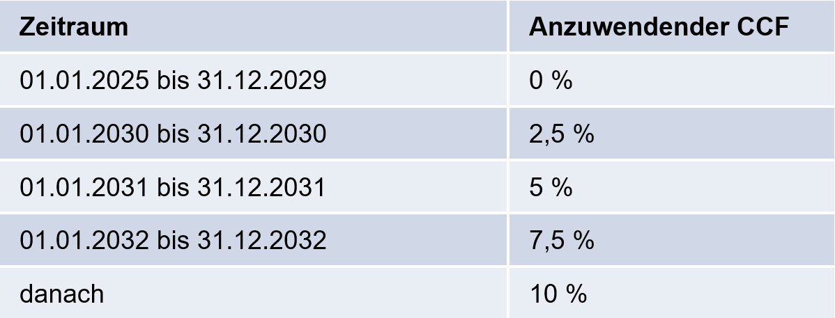 Der Kreditkonversionsfaktor (CCF) für jederzeit widerrufliche Kreditzusagen steigt stufenweise an. Die vollen zehn Prozent sind erst ab 2033 anzusetzen. Tabelle: GVB