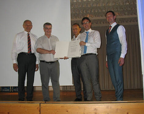 Die Elektrizitätsgenossenschaft Alzgruppe hat ihr 100-jähriges Bestehen gefeiert. Im Festzelt in Truchtlaching (Landkreis Traunstein) überbrachte GVB-Regionaldirektor Anton Kandler Glückwünsche des Verbands. Eine Goldene Raiffeisennadel des DRV gab es für Konrad Schlagbauer. Er hat sich als Mitglied im Aufsichtsrat und im Vorstand der Elektrizitätsgenossenschaft verdient gemacht und begleitet sie auch nach seiner aktiven Zeit. Die Alzgruppe betreibt drei Wasserkraftwerke sowie eine Windkraftanlage.
